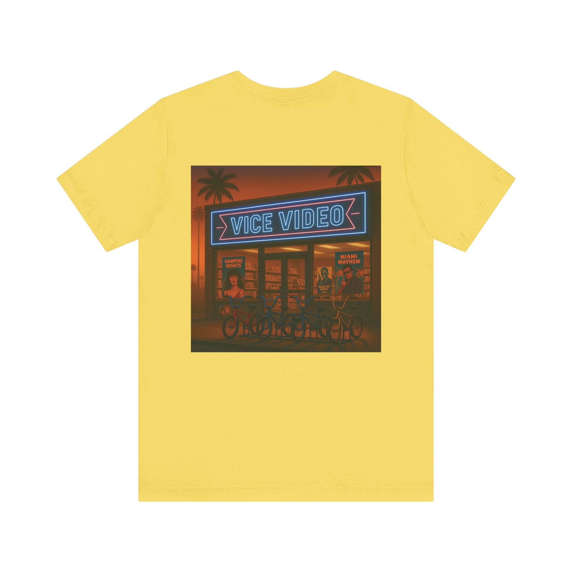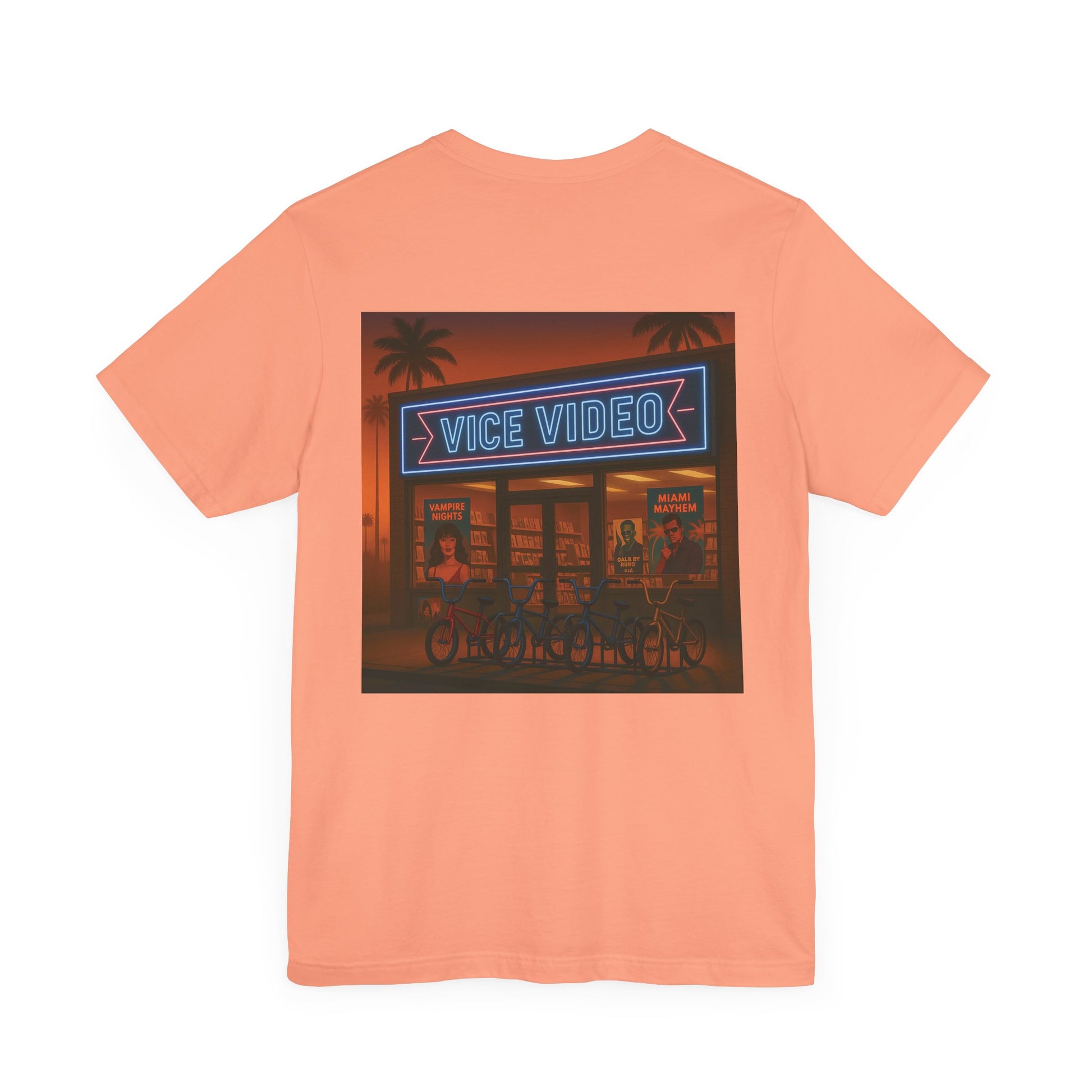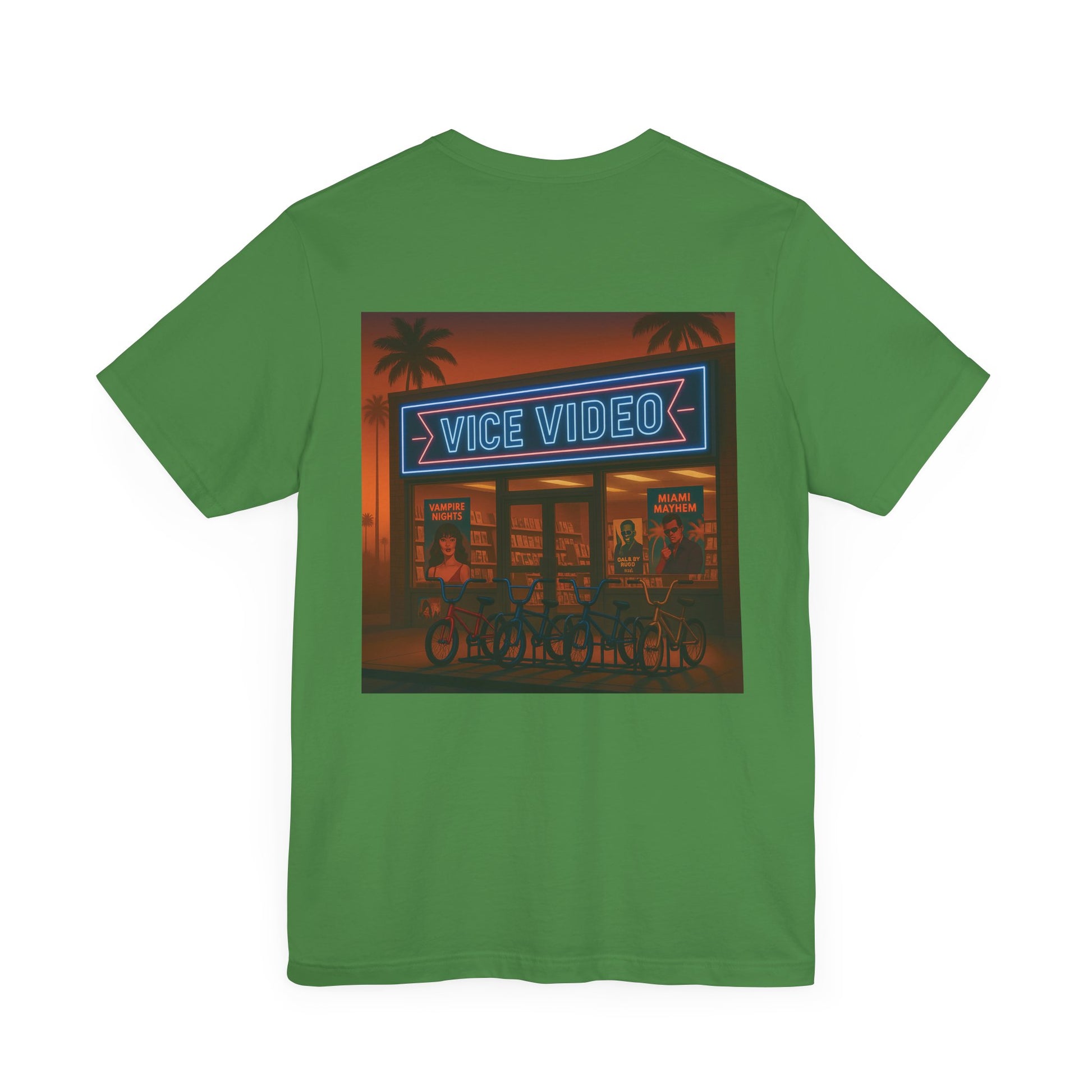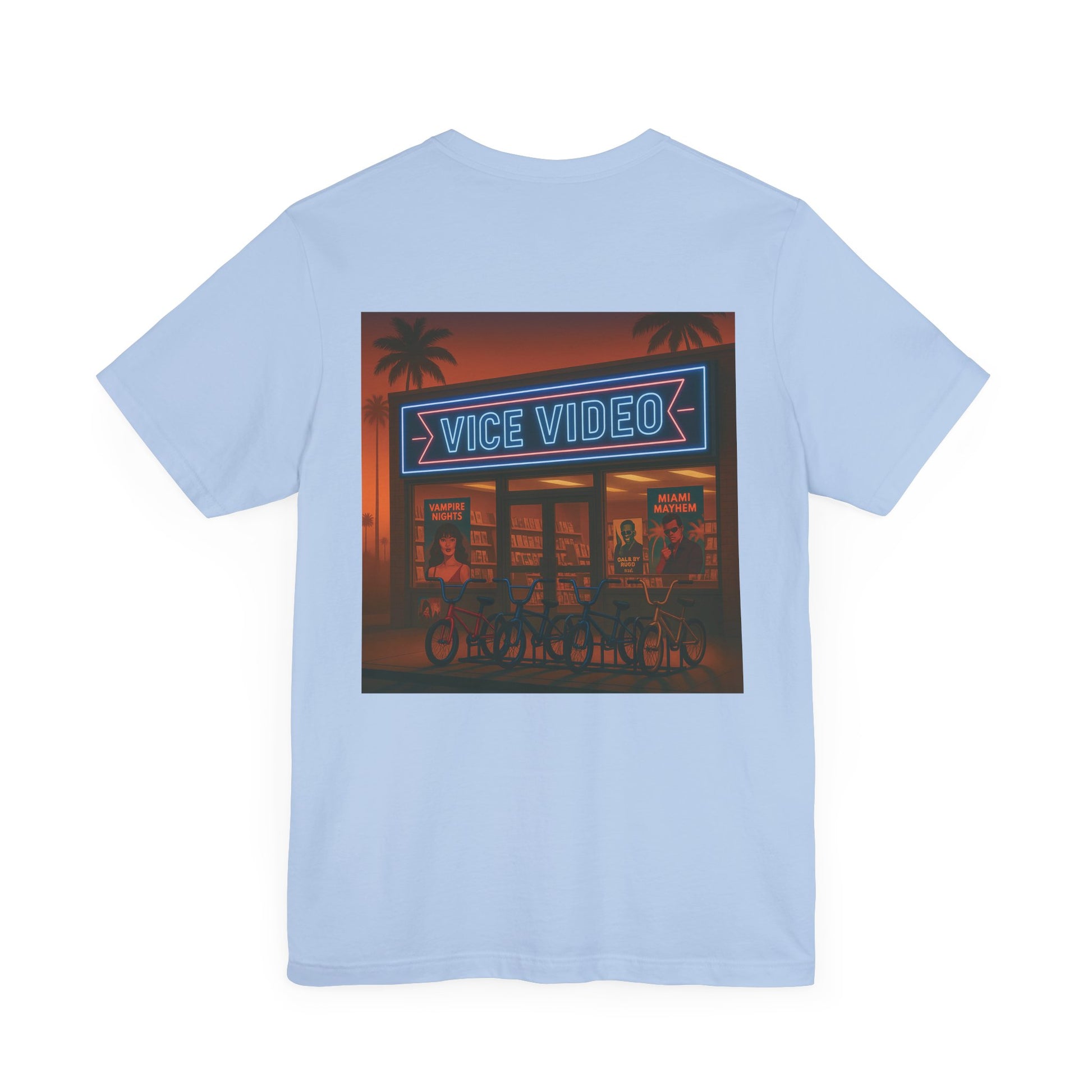Parked bikes rest outside as the sign blazes VICE VIDEO in classic blue and pink neon, while movie posters for “Vampire Nights” and “Miami Mayhem” promise Horror, action and thrills. This scene isn’t just printed—it’s projected straight from memory.