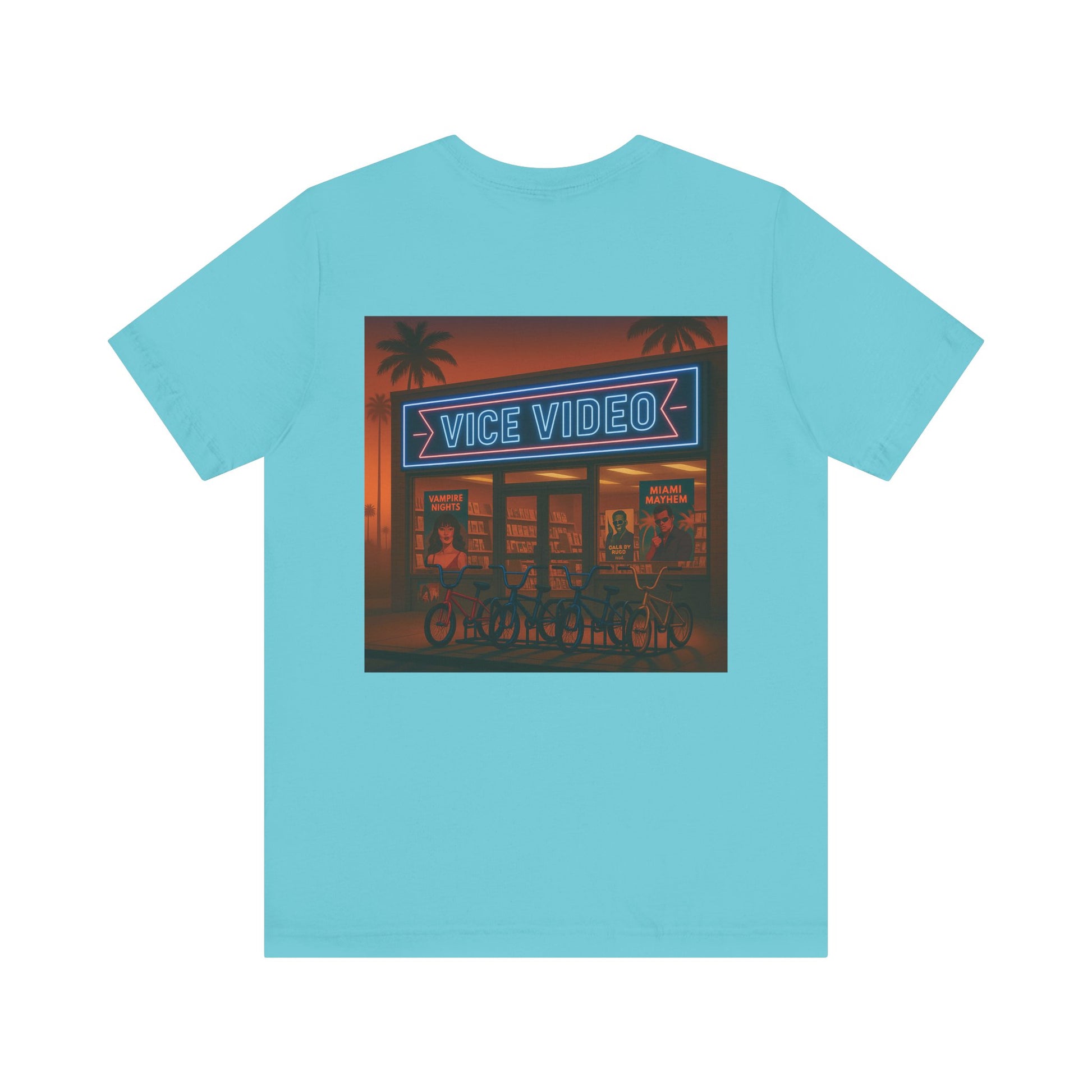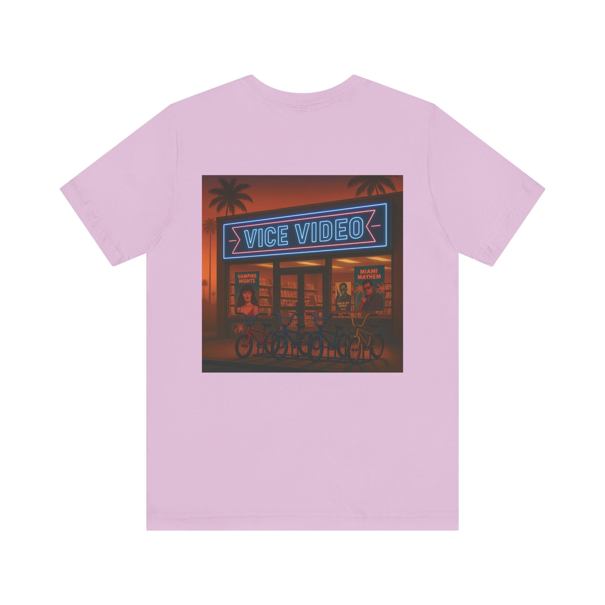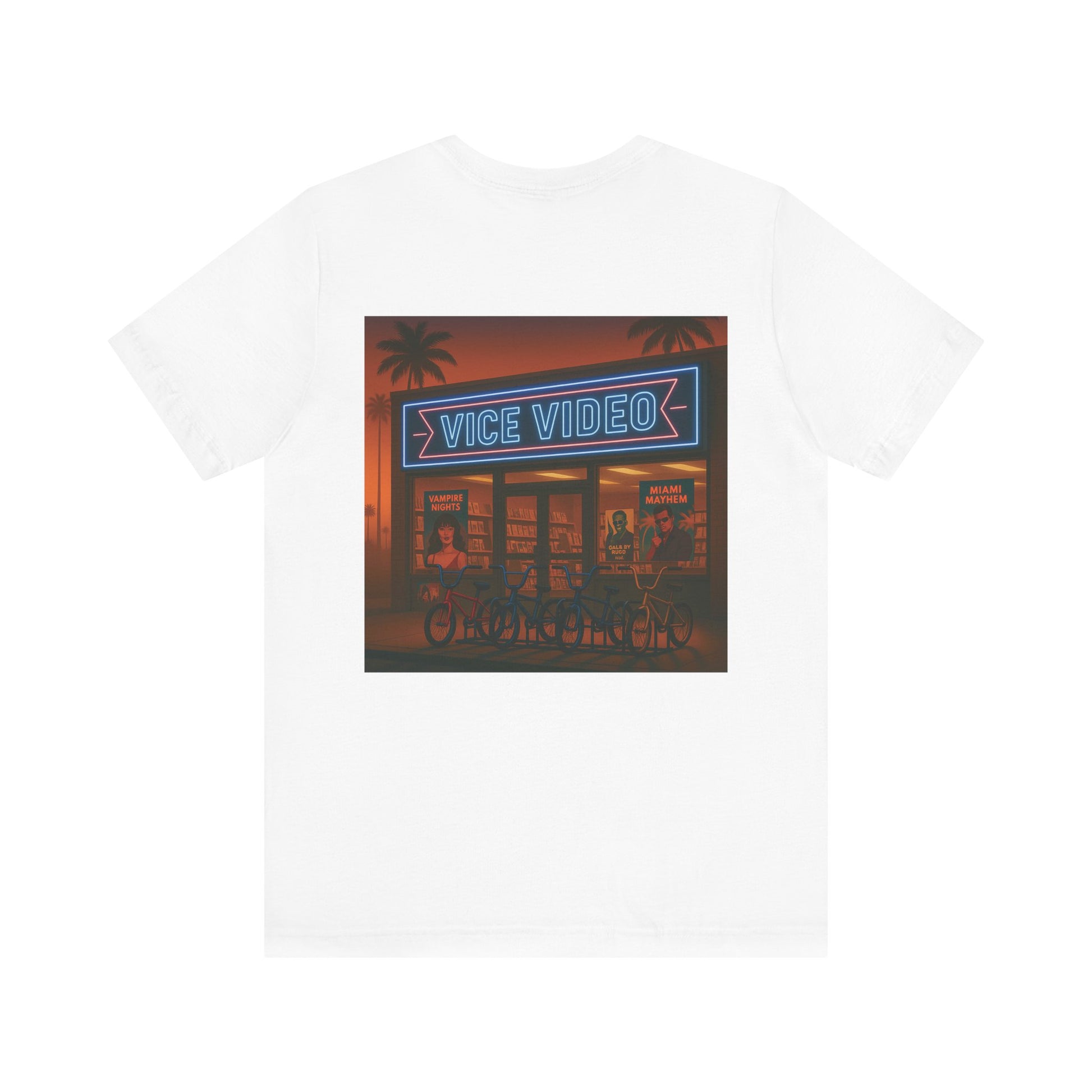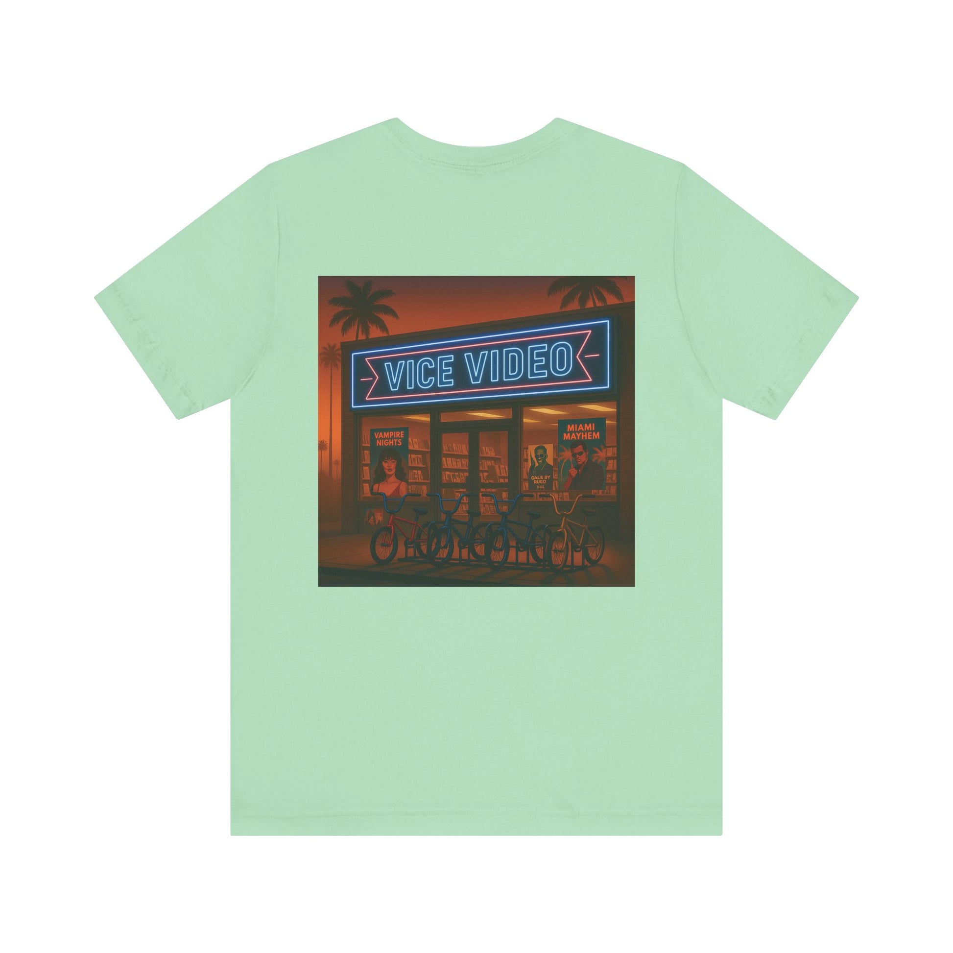 Parked bikes rest outside as the sign blazes VICE VIDEO in classic blue and pink neon, while movie posters for “Vampire Nights” and “Miami Mayhem” promise Horror, action and thrills. This scene isn’t just printed—it’s projected straight from memory.