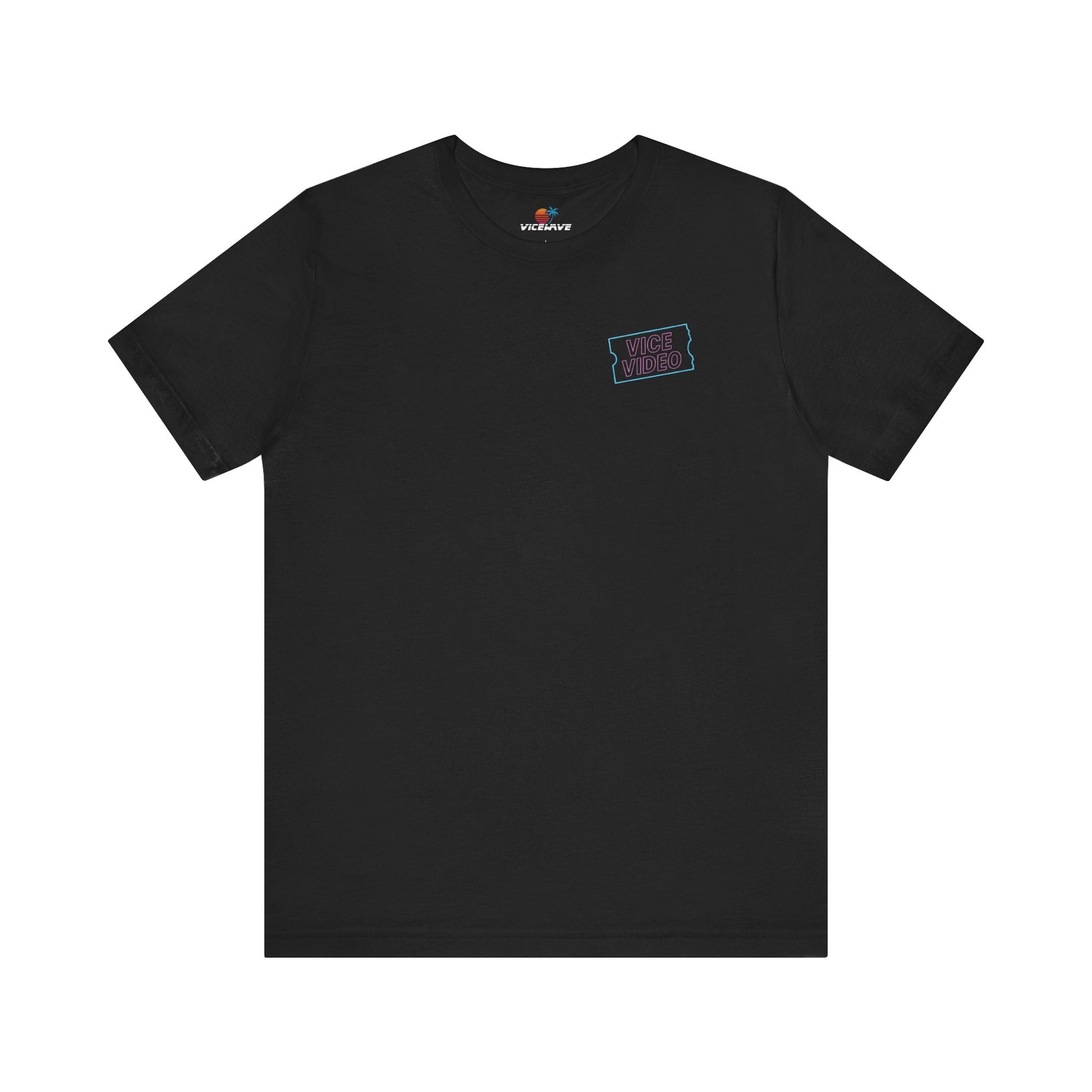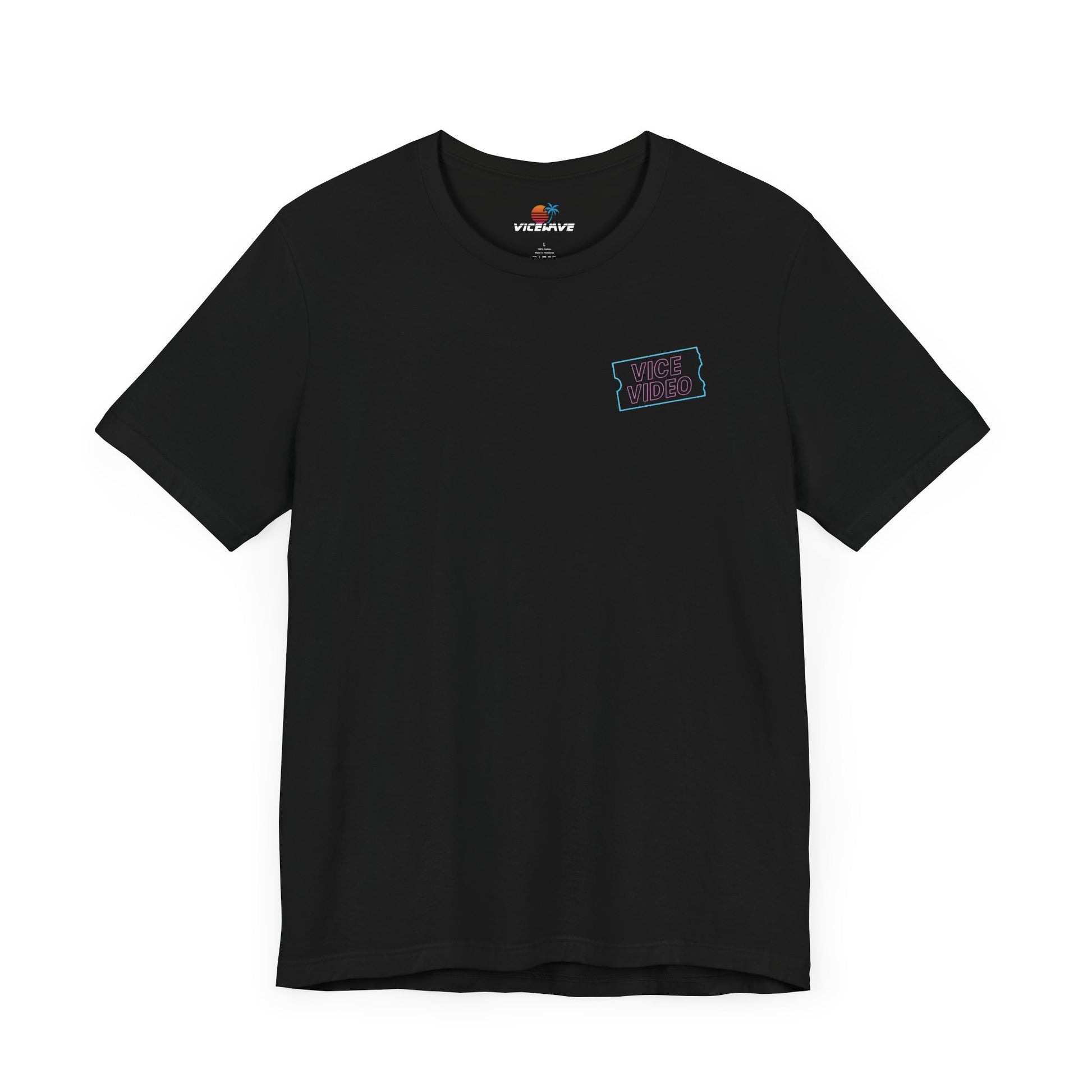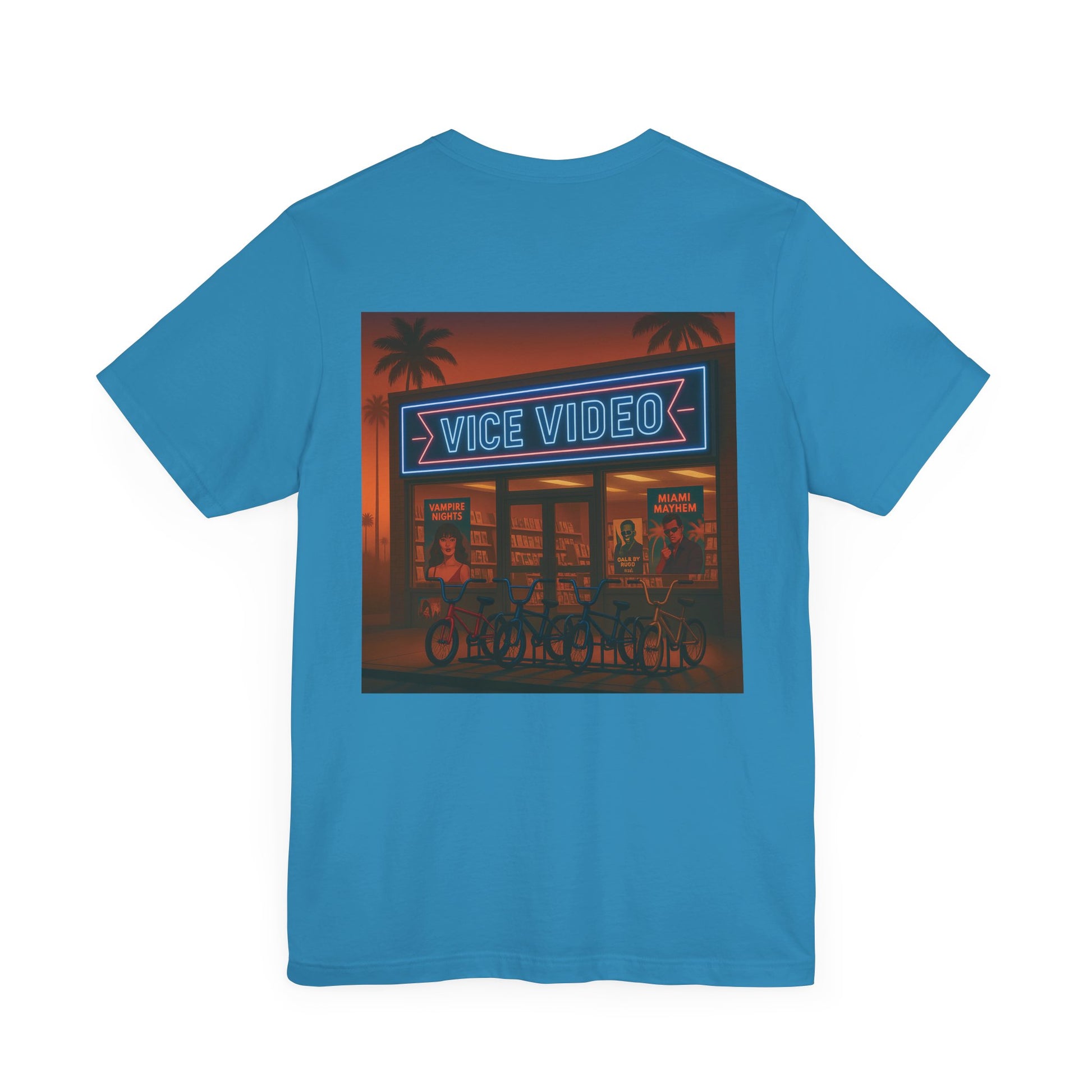 Step back into the glow of nostalgia with the Vice Video Tee, a wearable love letter to Friday night bike rides, neon-lit storefronts, and the golden age of VHS. Featuring a vibrant illustration of a retro video rental shop bathed in the warm glow of dusk, this tee captures the magic of simpler times — where the only plan was picking the perfect flick.