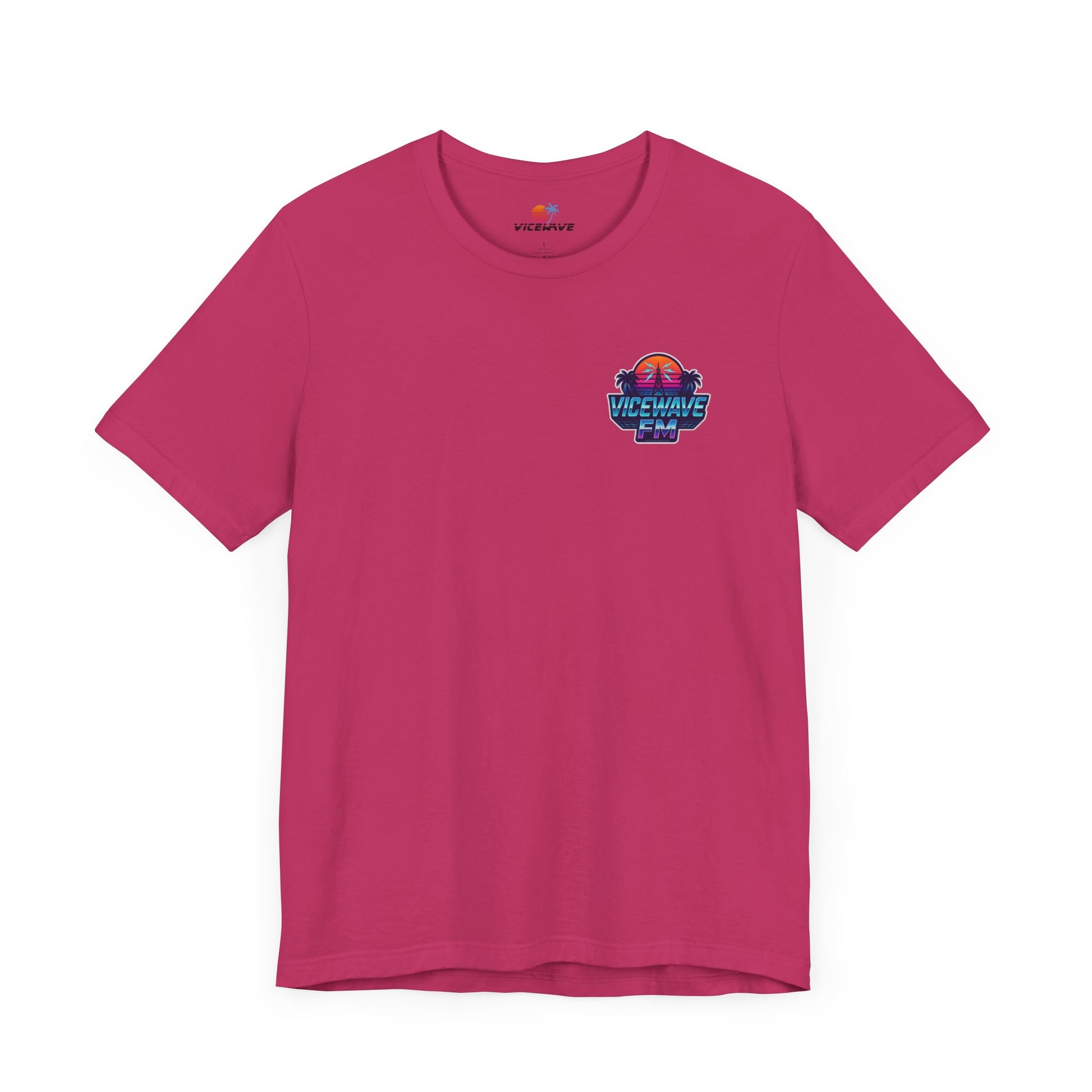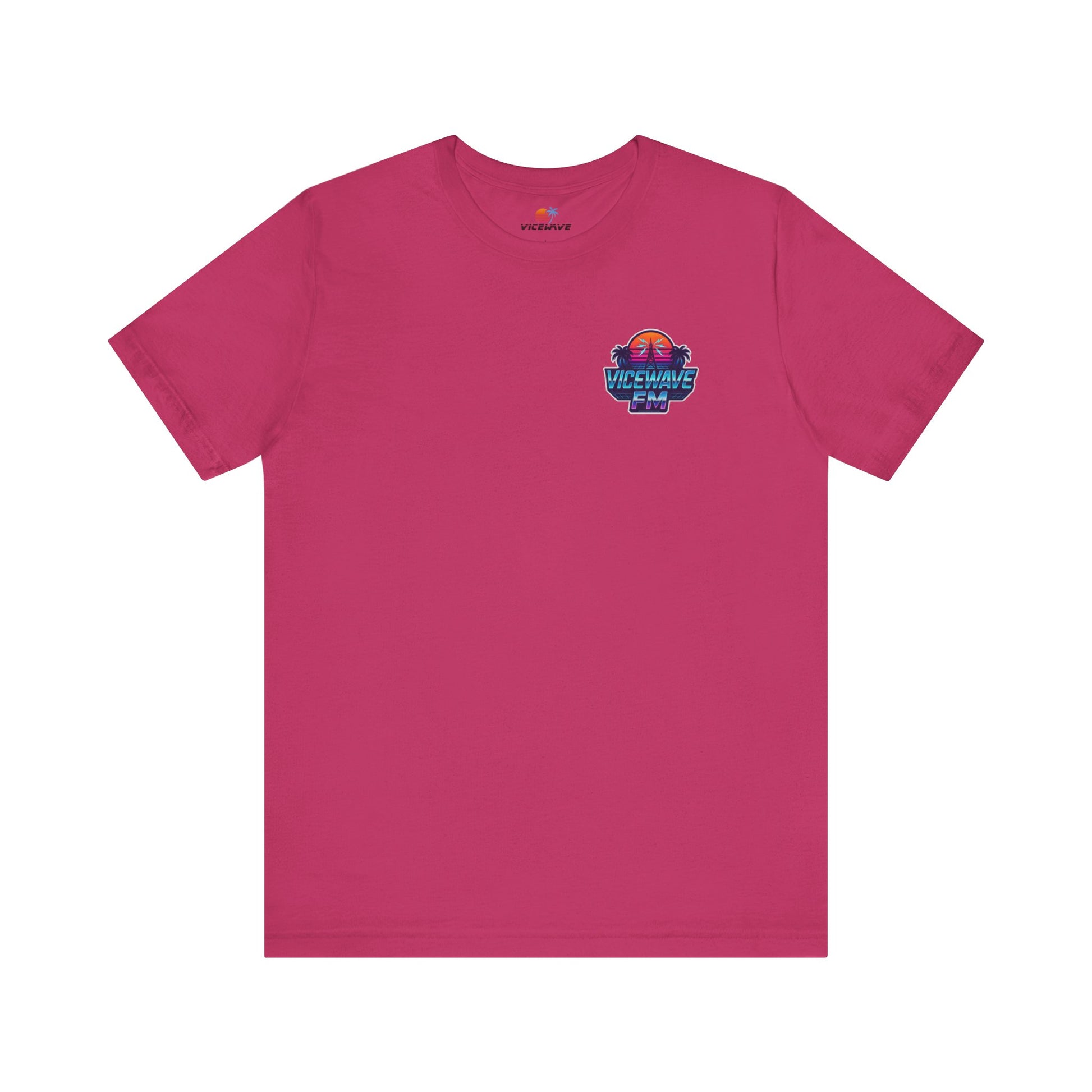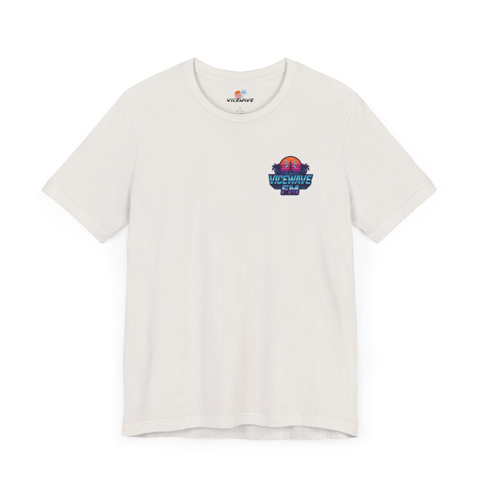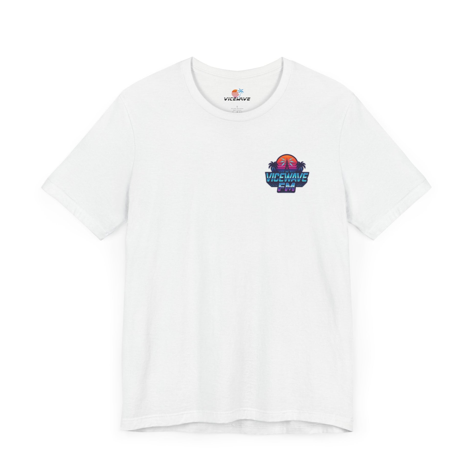 Framed by silhouetted palms and styled in electric gradients of cyan, magenta, and ultraviolet, the Vicewave FM logo gives you that perfectly tuned aesthetic for cruising boulevards or Jammin' out to your summer mixtape. Whether you're vibing poolside or dropping your favorite playlist, this tee keeps your look on the right wavelength.
