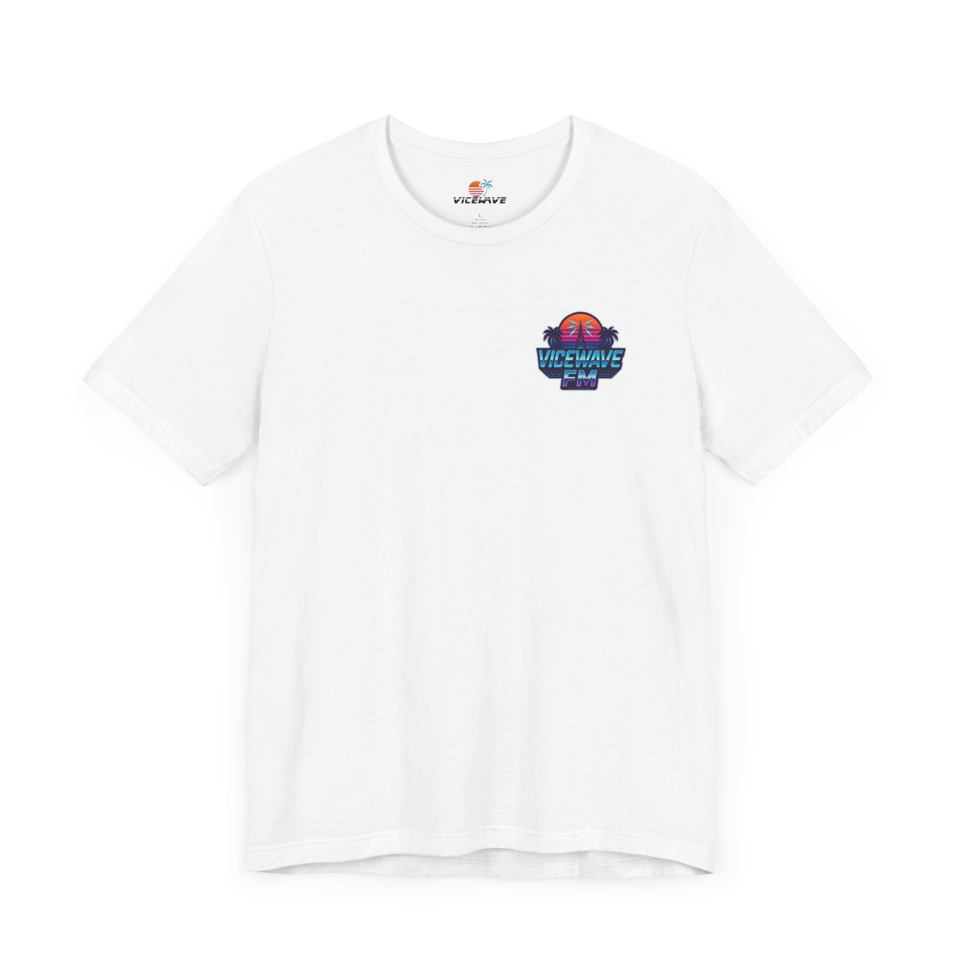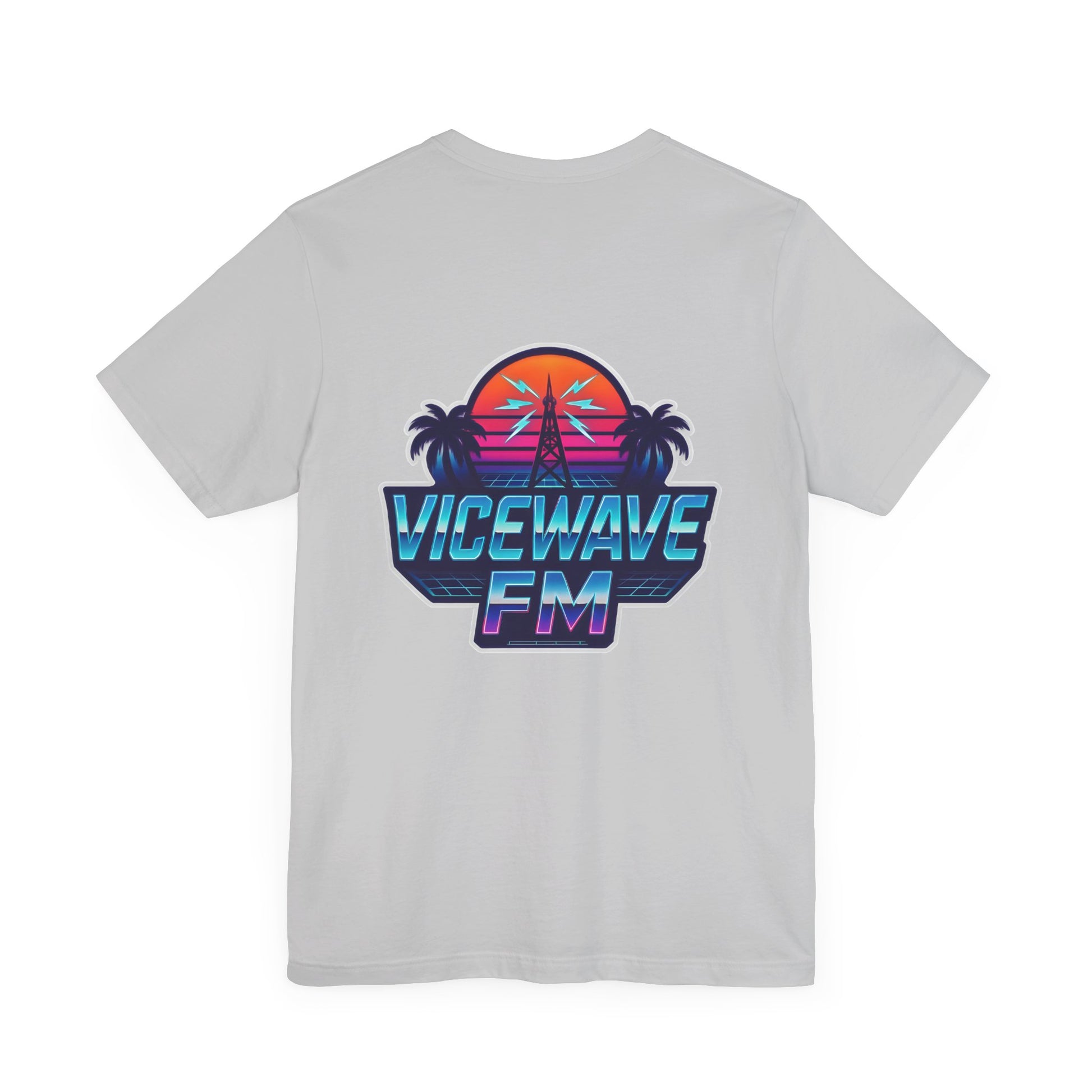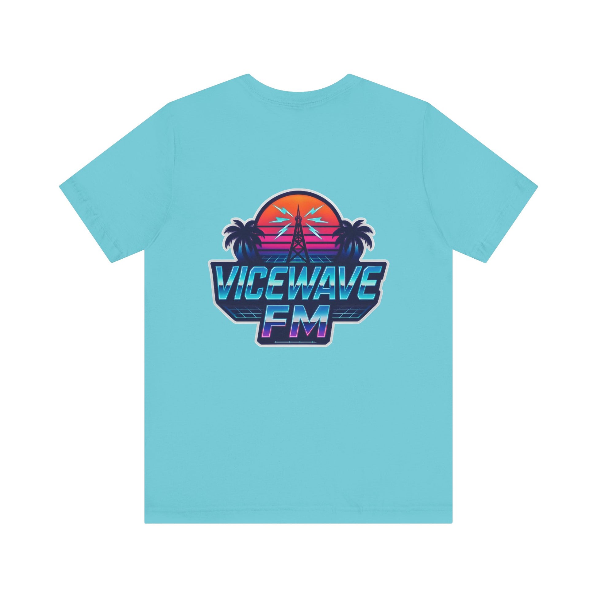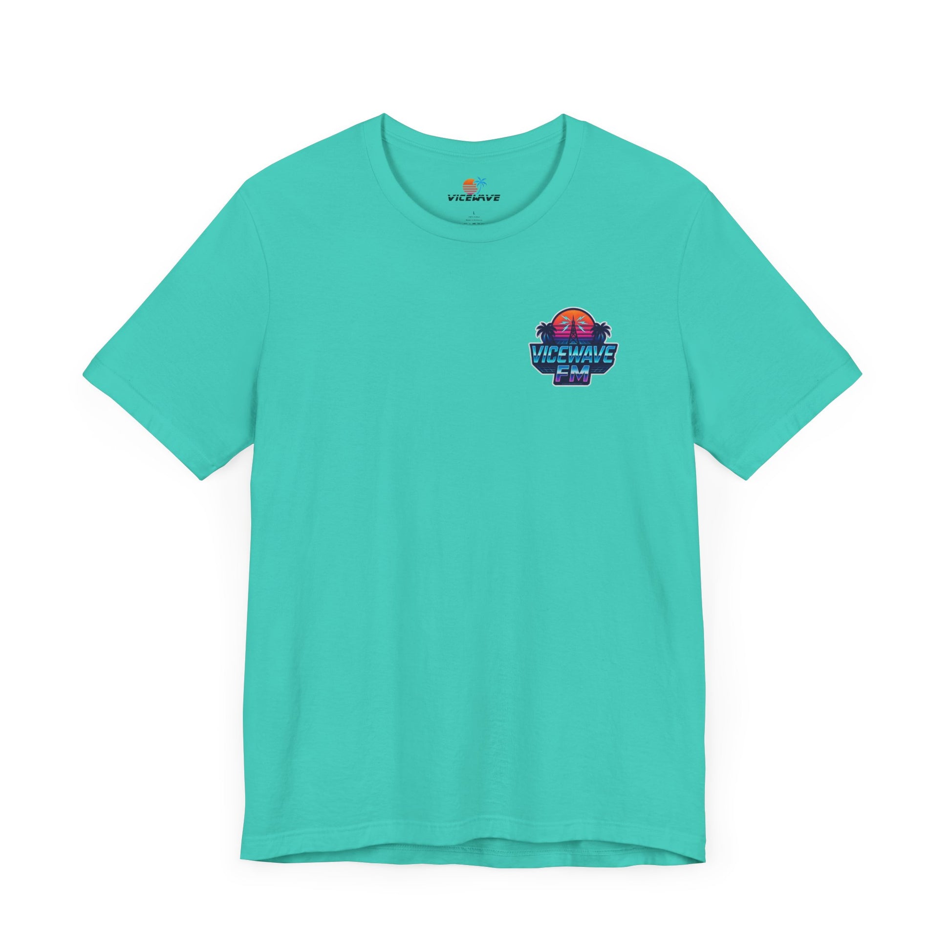 Framed by silhouetted palms and styled in electric gradients of cyan, magenta, and ultraviolet, the Vicewave FM logo gives you that perfectly tuned aesthetic for cruising boulevards or Jammin' out to your summer mixtape. Whether you're vibing poolside or dropping your favorite playlist, this tee keeps your look on the right wavelength.