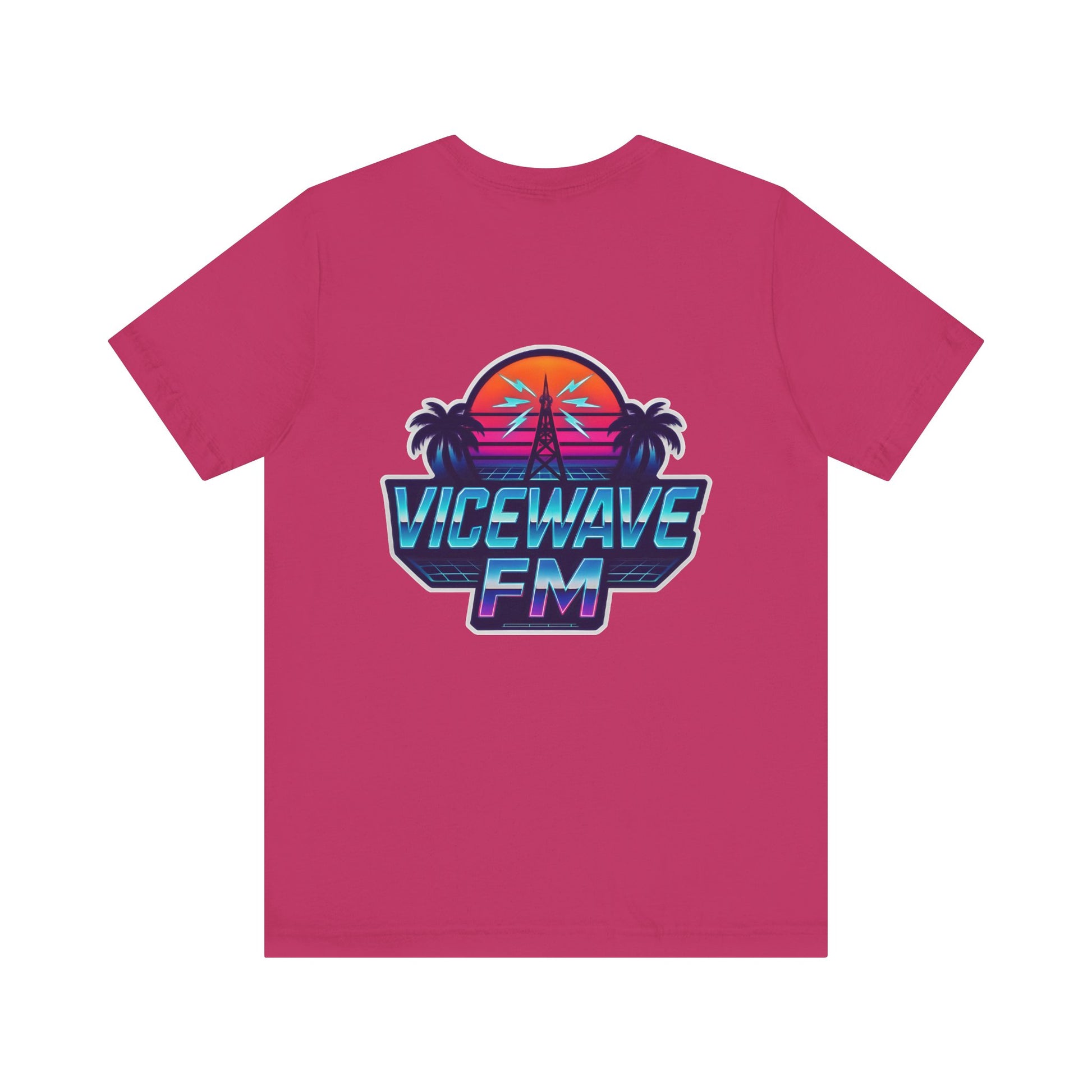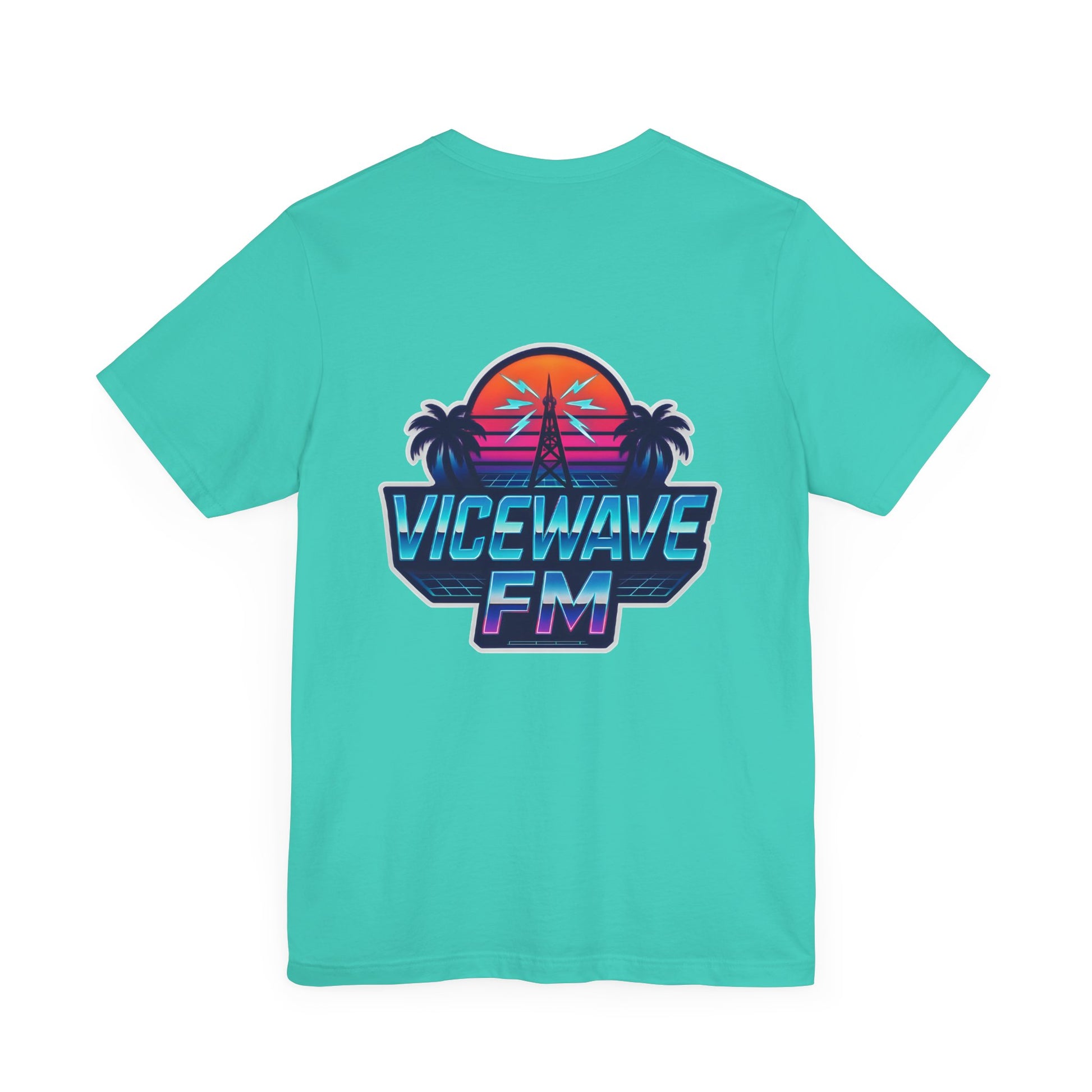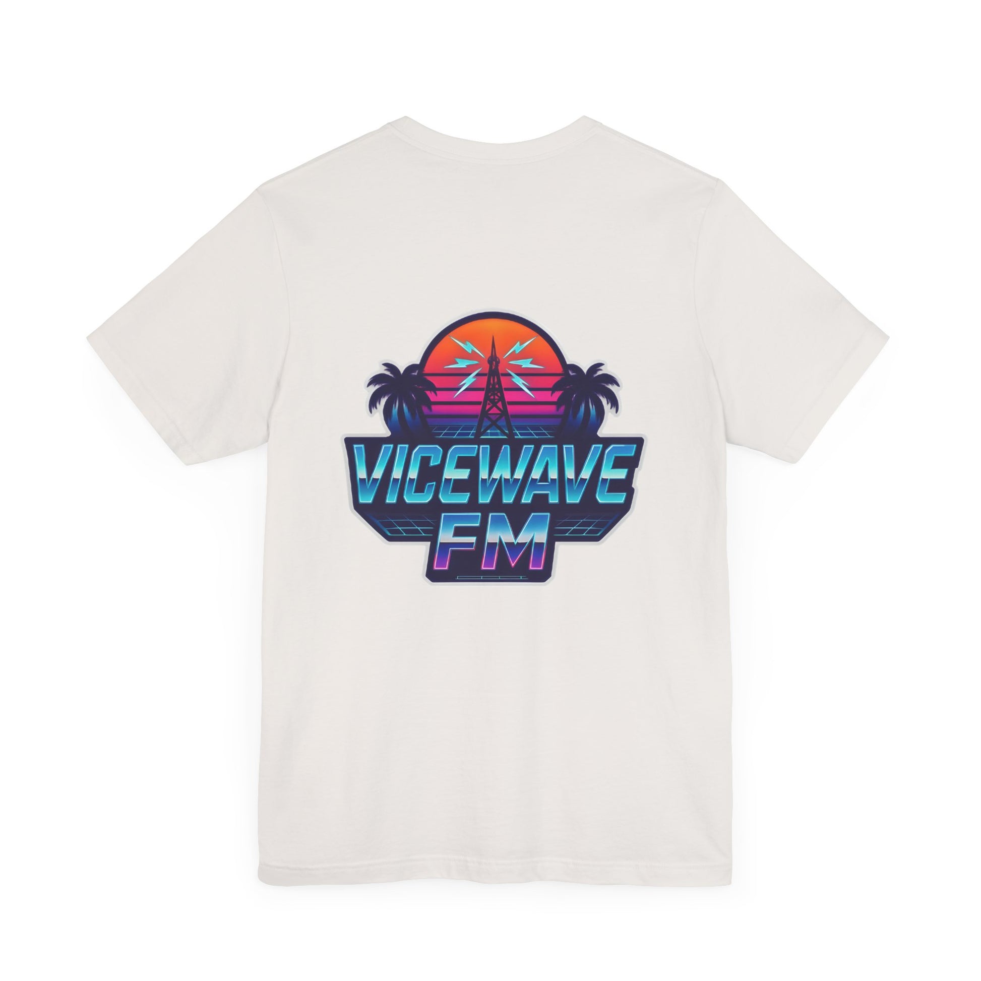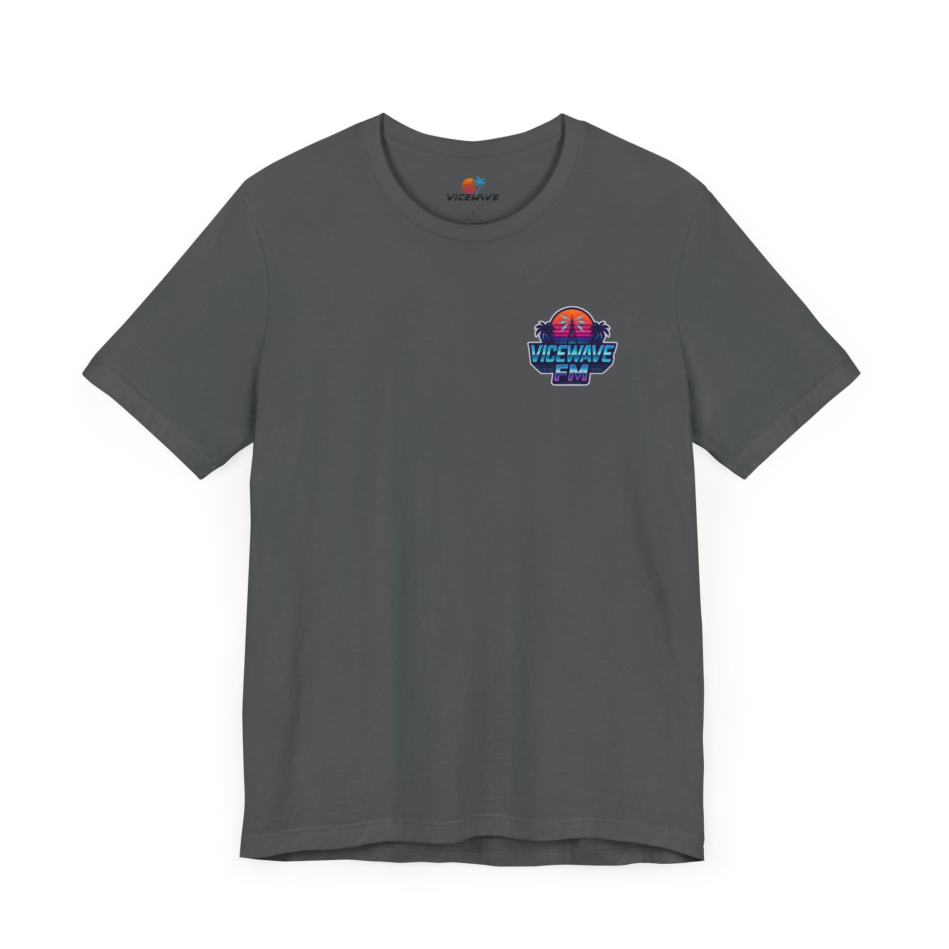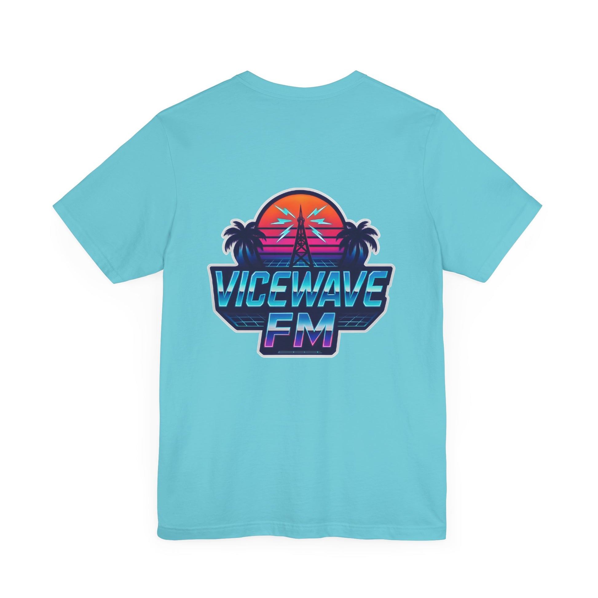 Framed by silhouetted palms and styled in electric gradients of cyan, magenta, and ultraviolet, the Vicewave FM logo gives you that perfectly tuned aesthetic for cruising boulevards or Jammin' out to your summer mixtape. Whether you're vibing poolside or dropping your favorite playlist, this tee keeps your look on the right wavelength.